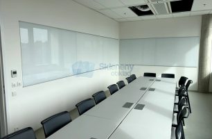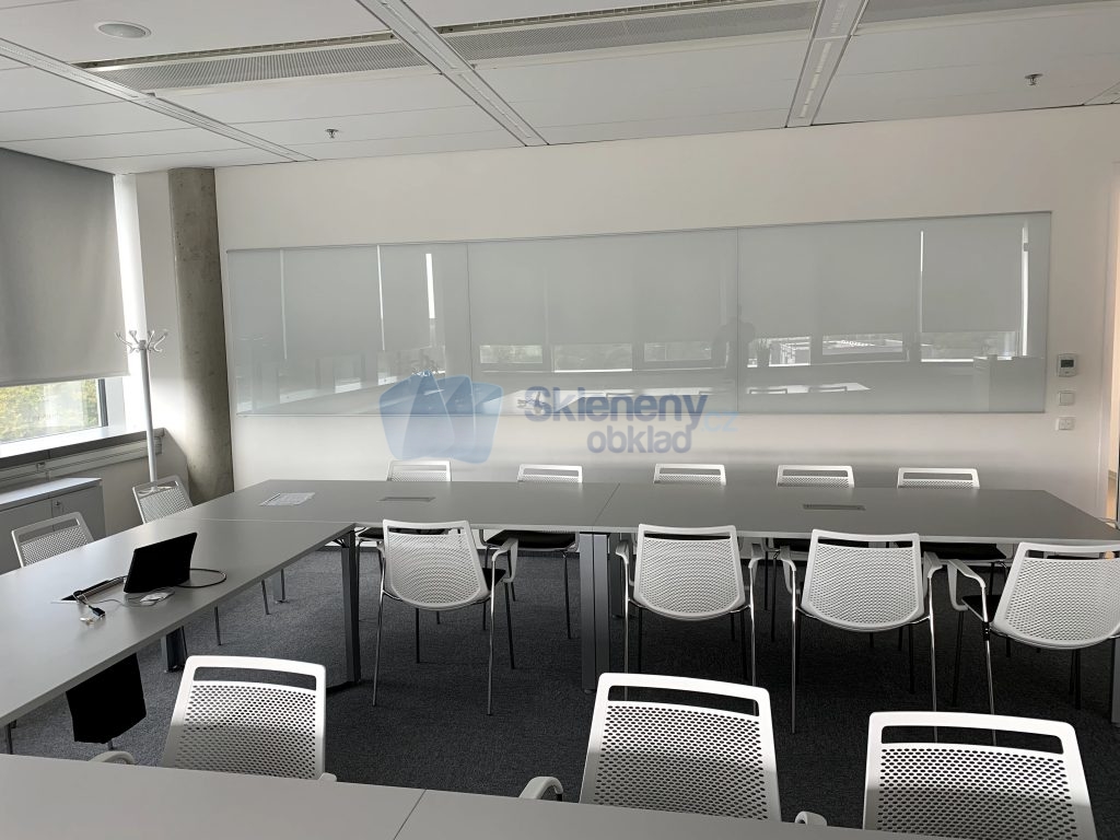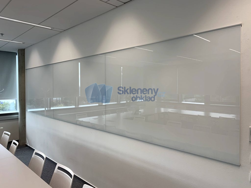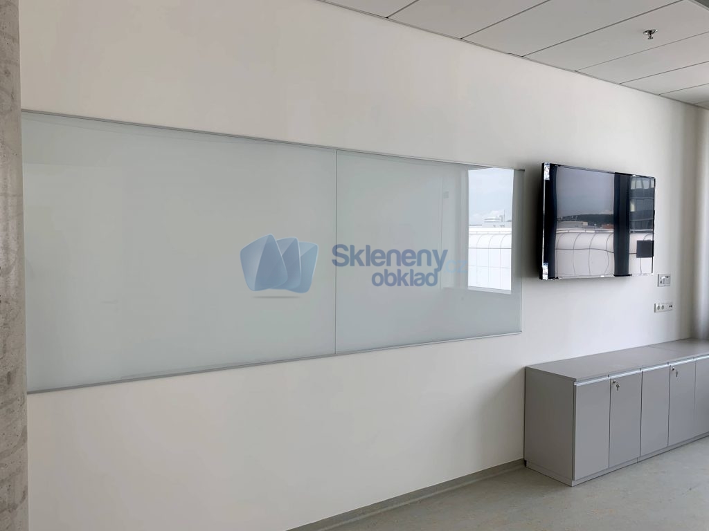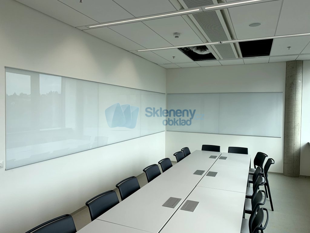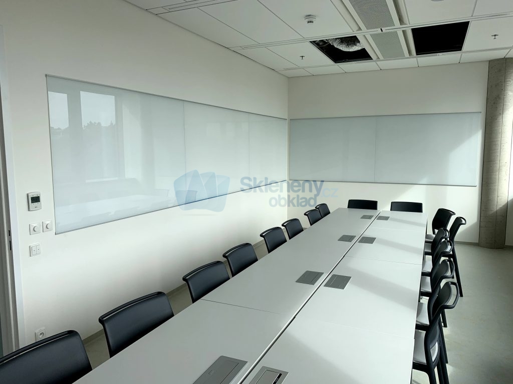 Realizácia sklenených tabúľ v bielej farbe pre brniansky kampus Masarykovej univerzity. Tabule sú z tvrdeného skla, lakované odolnou farbou zo zadnej strany. Podľa zadania projektanta sú sklenené tabule kotvené do hliníkových profilov na hornej a dolnej hrane skiel, v presnej výške. Šírky tabúľ boli vyrobené na mieru presne podľa rozmerov múru v každej miestnosti. Tabule sú rozdelené na rovnaké diely a vzniknuté škáry medzi sklami sú minimálne.